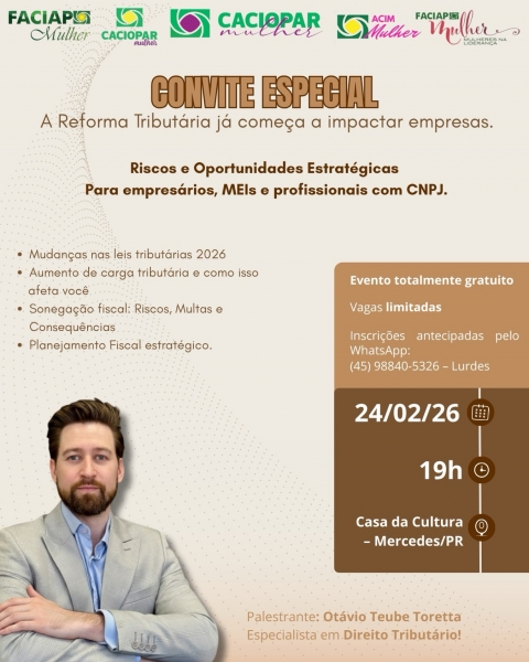 O encontro, organizado pelo Núcleo da Mulher Empresária da ACIM, terá como tema os riscos e oportunidades estratégicas diante das mudanças na legislação tributária, que já começam a impactar empresas. Entre os assuntos que serão abordados estão as alterações previstas para 2026, aumento da carga tributária, sonegação fiscal — com foco em riscos, multas e consequências — além de planejamento fiscal estratégico.