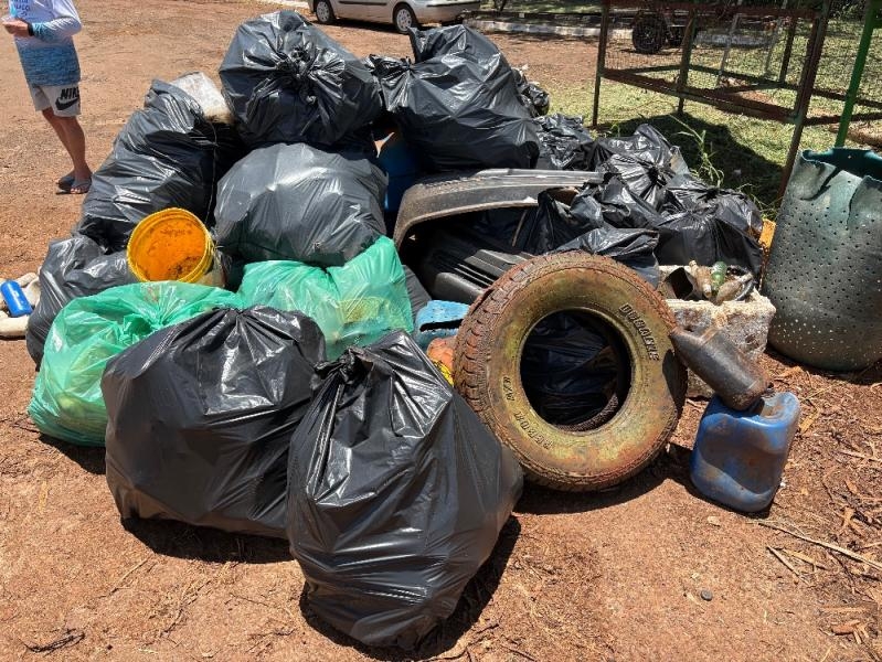 Foram retirados diversas embalagens plásticas, galões e pneu, além de frascos de agrotóxicos. O lixo recolhido foi encaminhado para a destinação correta.