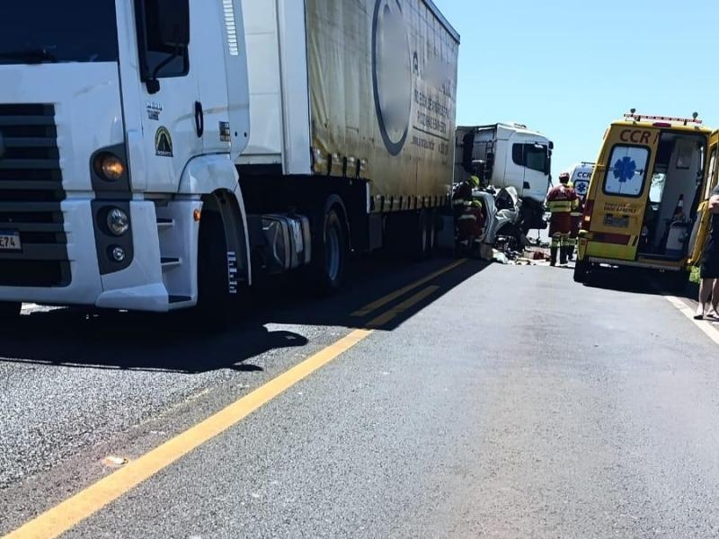 Conforme testemunhas, uma carreta estava parada em trecho de “pare e siga”. Atrás estavam a picape Fiat Toro e o Gol. Desgovernada, outra carreta que seguia no mesmo sentido bateu nos dois carros. O Gol foi jogado para fora da pista e a Toro parou embaixo da carreta da frente.