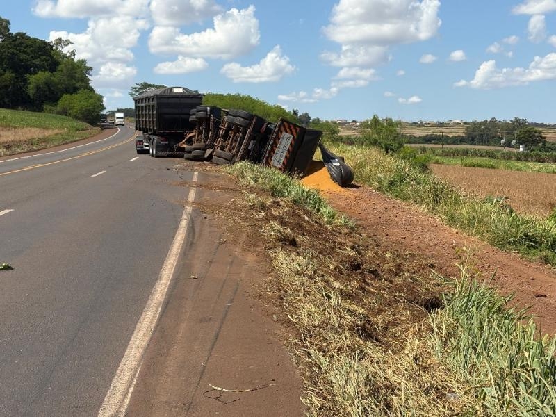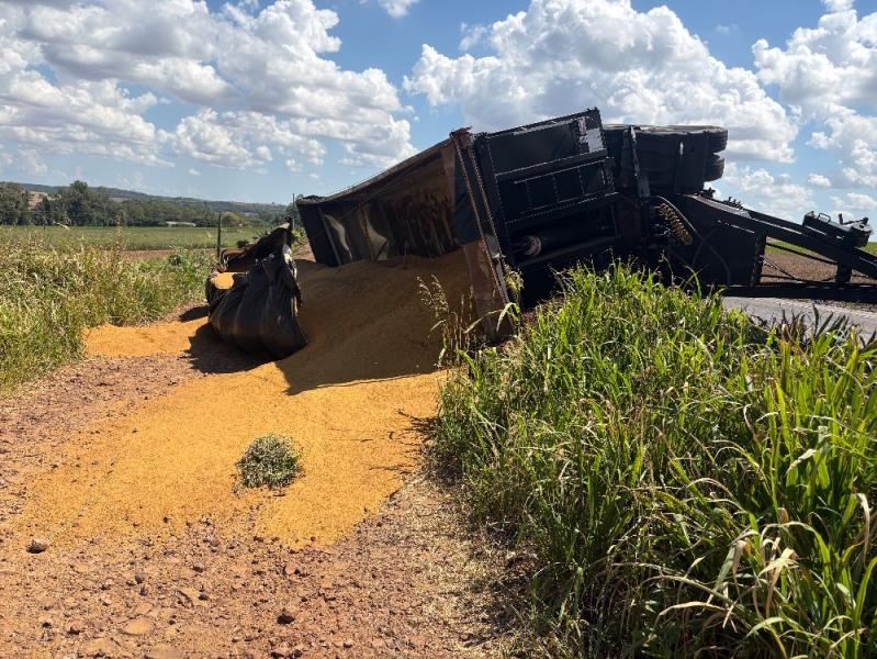 Não houve feridos no sinistro e a carga de farelo de milho ficou espalhada em uma estrada rural as margens da BR-163.