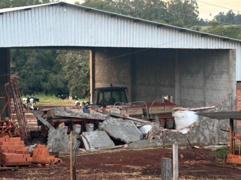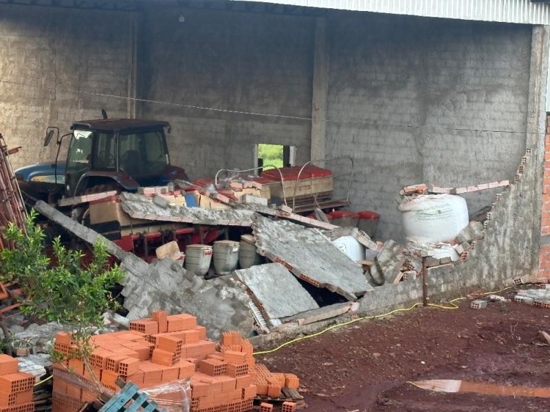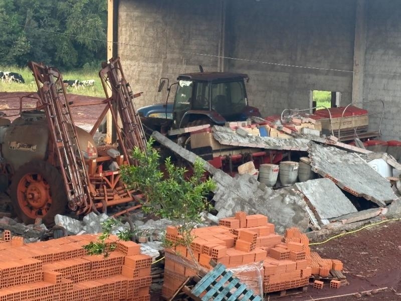 Ainda na mesma propriedade rural, a força dos ventos derrubou a parede de um barracão sobre máquinas agrícolas, deixando danos na plantadeira e pulverizador.