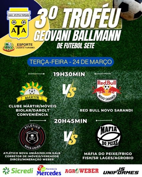 O 3º Troféu Geovani Ballmann de Futebol Sete terá sequência nesta terça-feira (24), com mais dois confrontos na Associação Tapejara, em Mercedes, válidos pela fase de grupos da competição.
