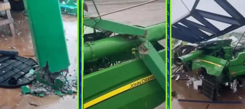 Além disso, o telhado de zinco da construção foi arrancado, e parte das chapas metálicas acabou caindo sobre maquinários agrícolas, que também sofreram avarias. Apesar dos prejuízos materiais, não há registro de feridos.