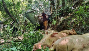 Caminhão com porcos cai em ribanceira no interior de Cascavel e motorista sobrevive