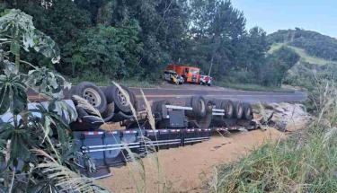 Carreta carregada com farrinha tomba na BR-163 em Marechal Rondon
